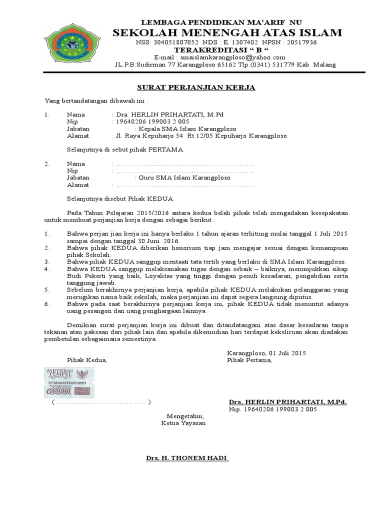 Inilah isi surat perjanjian kontrak (spk) guru dan tenaga kependidikan non pns dengan kepsek diketahui dalam surat perjanjian kerja (spk) paling atas sebelah kiri loga kontrak kerja. 6 contoh surat perjanjian kerja sedehana dan terlengkap 2019.
